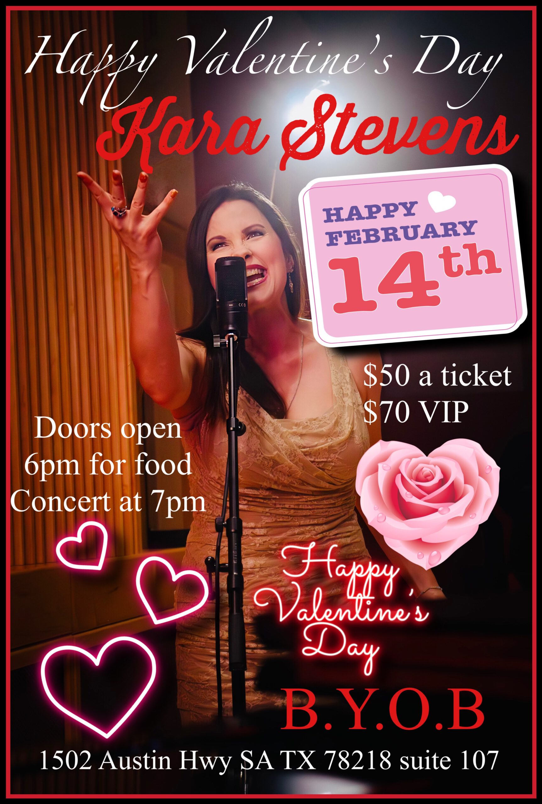 Please choose from the options below to pick you ticket type for the February 14 concert. Doors will open at 6:00 pm so that guests can enjoy some fabulous food. The concert will begin at 7:00 pm and will last for 2 hours.